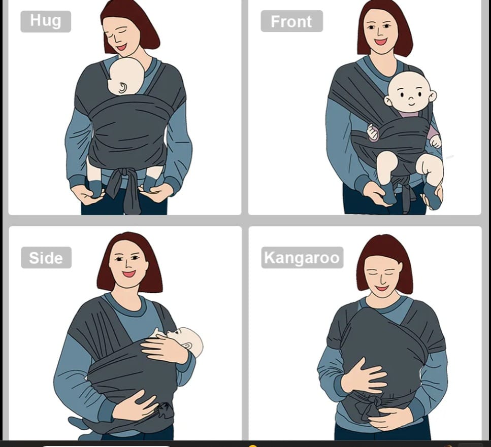 iii. Several carry positions (front, hip, newborn cradle carry).